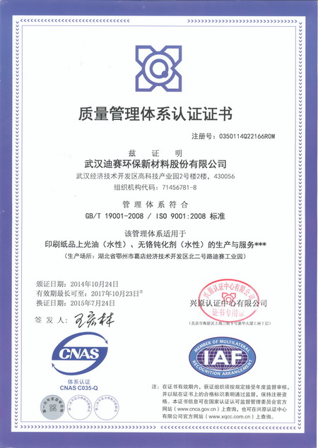 公司早在2007年就通过ISO9001国际质量管理体系标准认证和ISO14001国际环境管理体系标准认证,又在2014年通过了TS16949管理体系标准认证。公司在严格的标准控制框架下,确保向客户提供的钝化剂产品,品质稳定,环保健康!